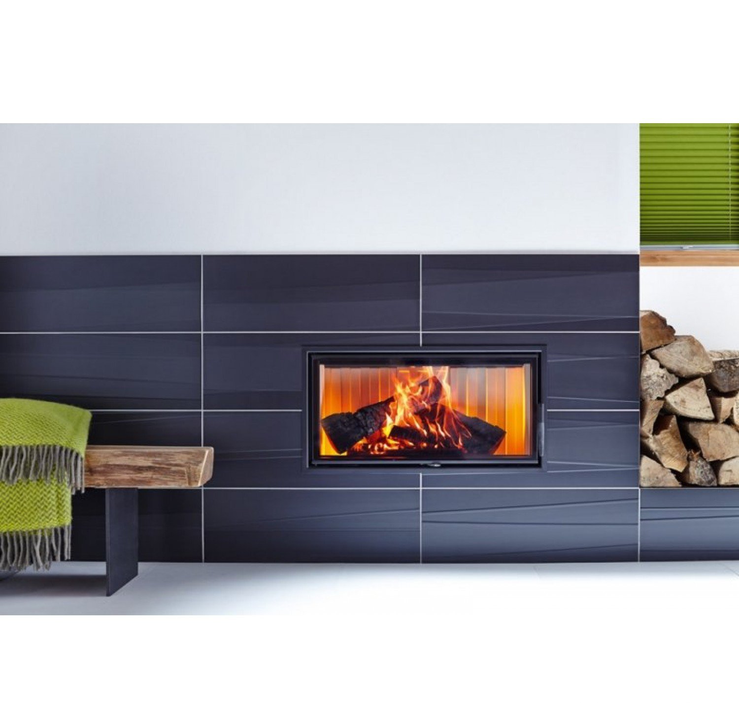 Конструкция каминной топки, изготовленная из стали с антикоррозийным покрытием. Шамотный камень, выложенный внутри топки, сохраняет жар на длительное время. Прямоугольная дверь с прямым стеклом открывает всю красоту пламени огня. Дверца открывается в сторону. Функция "вторичный дожиг" отвечает за полное сгорание дров в топке.