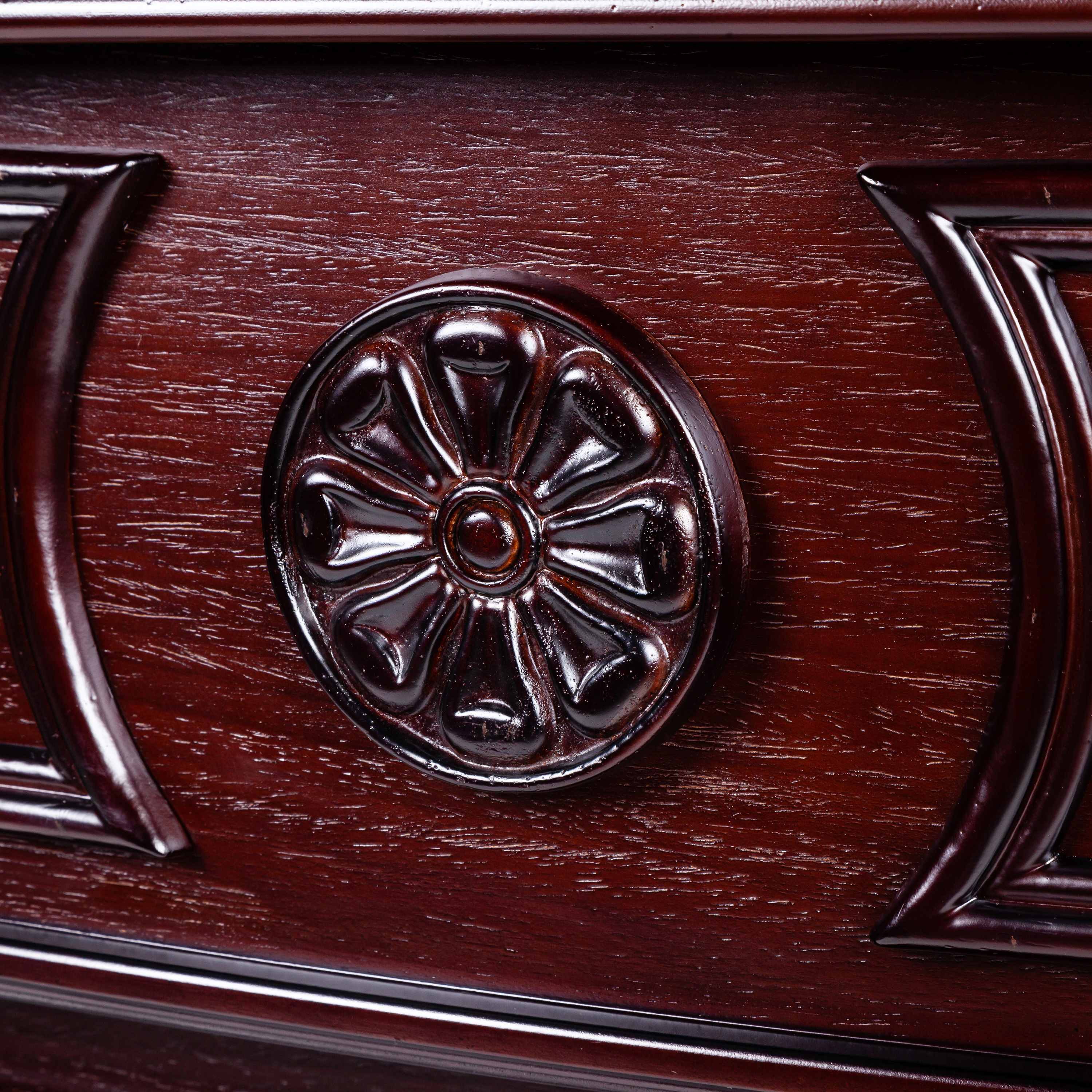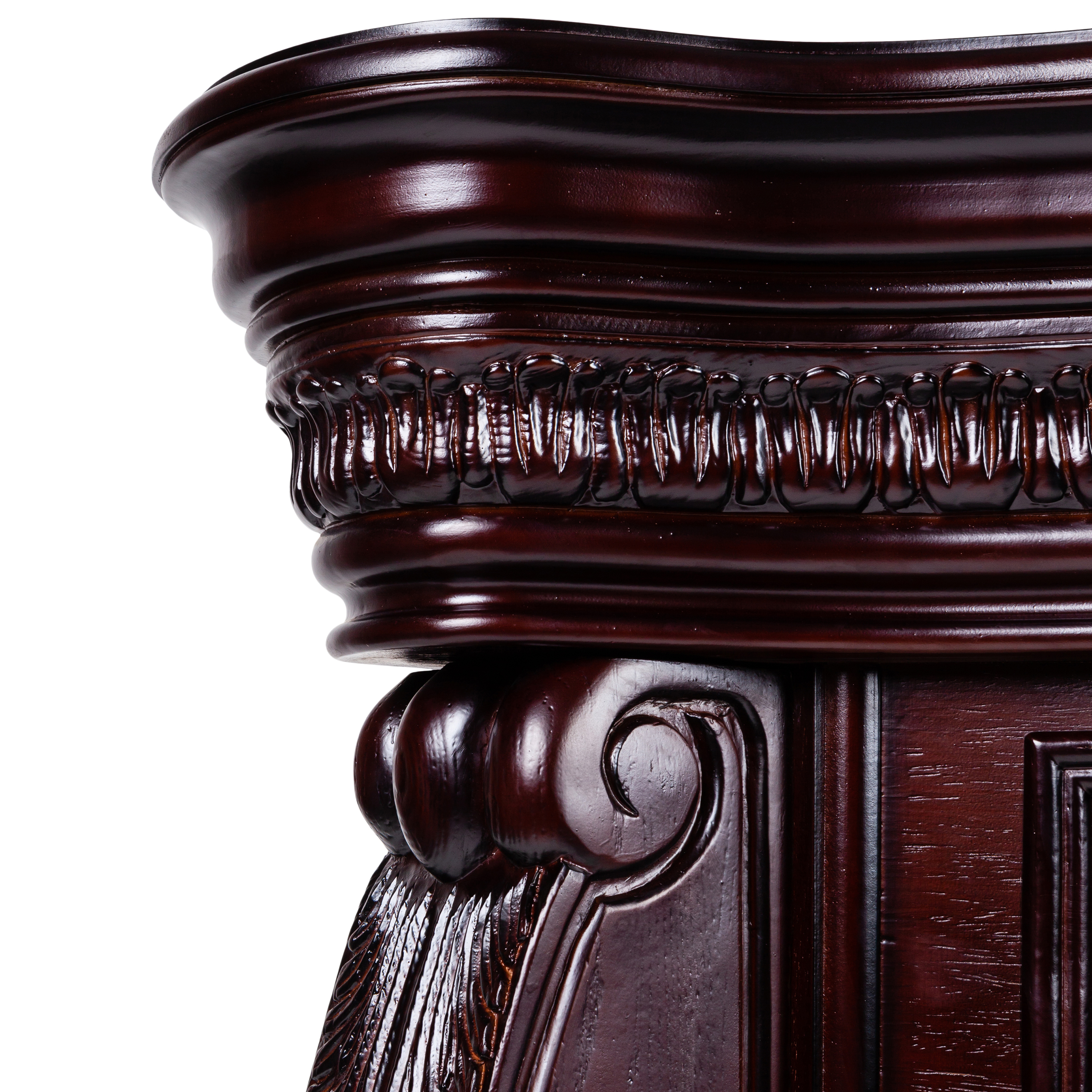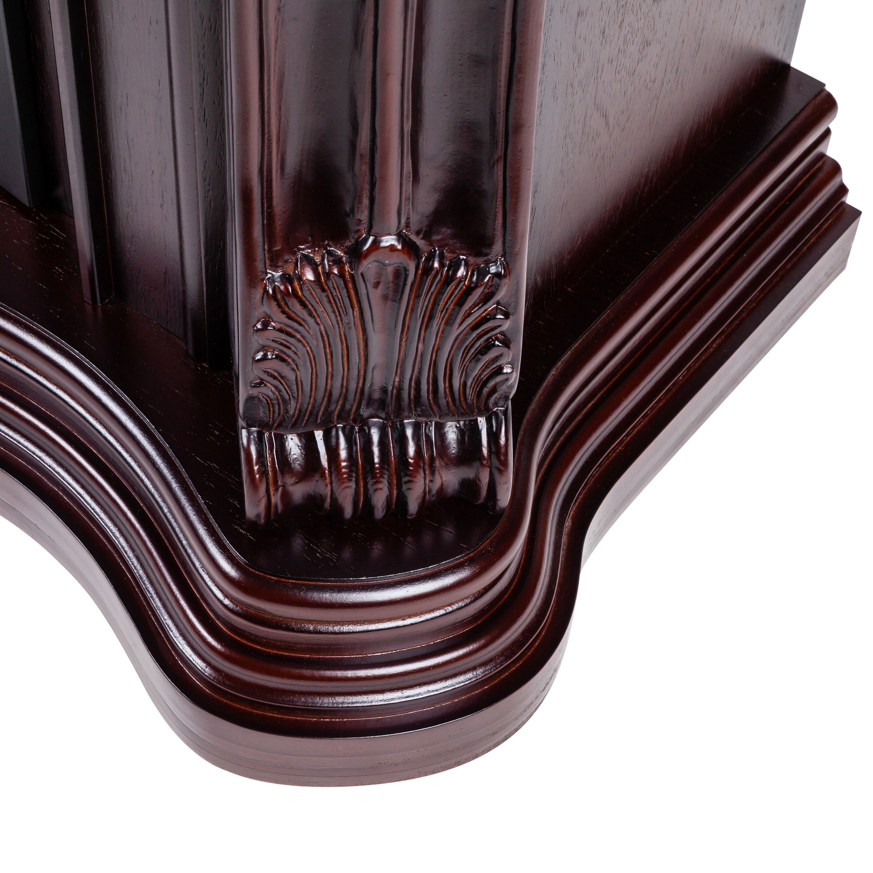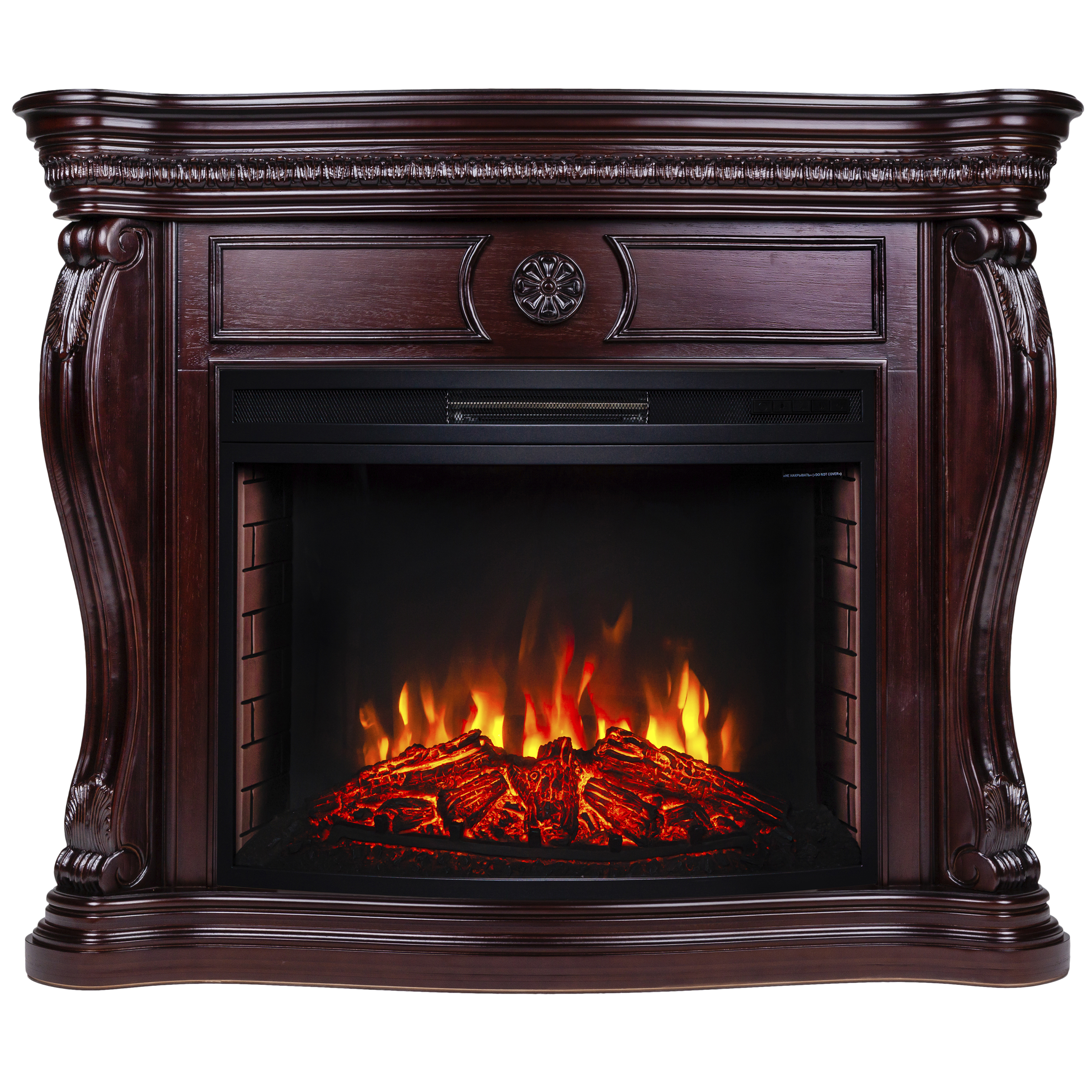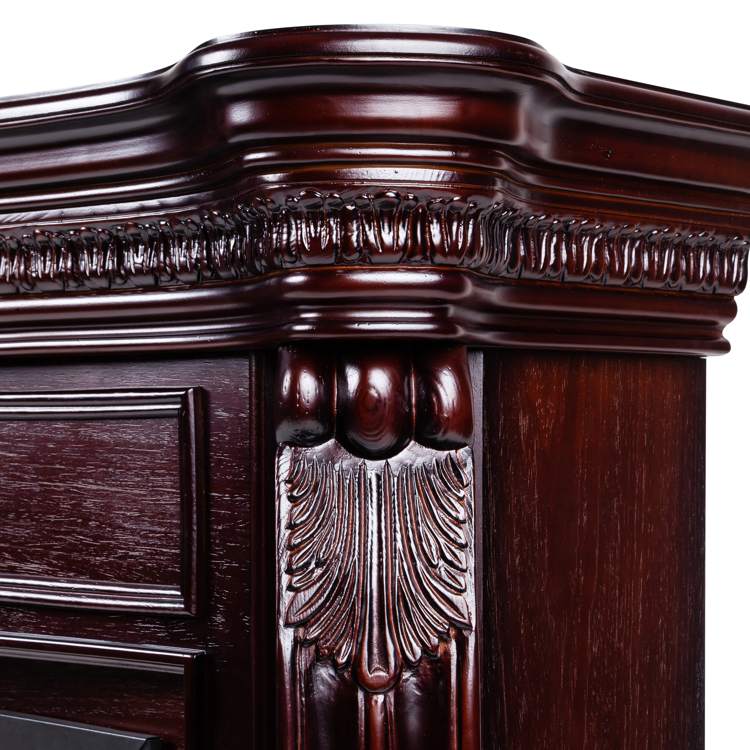• Выполнен из качественного МДФ, тонированного в цвет античного дуба. Изысканная форма портала, верхняя панель украшена аппликацией из натурального шпона, карниз портала декорирован профилем и прекрасно выполненными резными листьями.