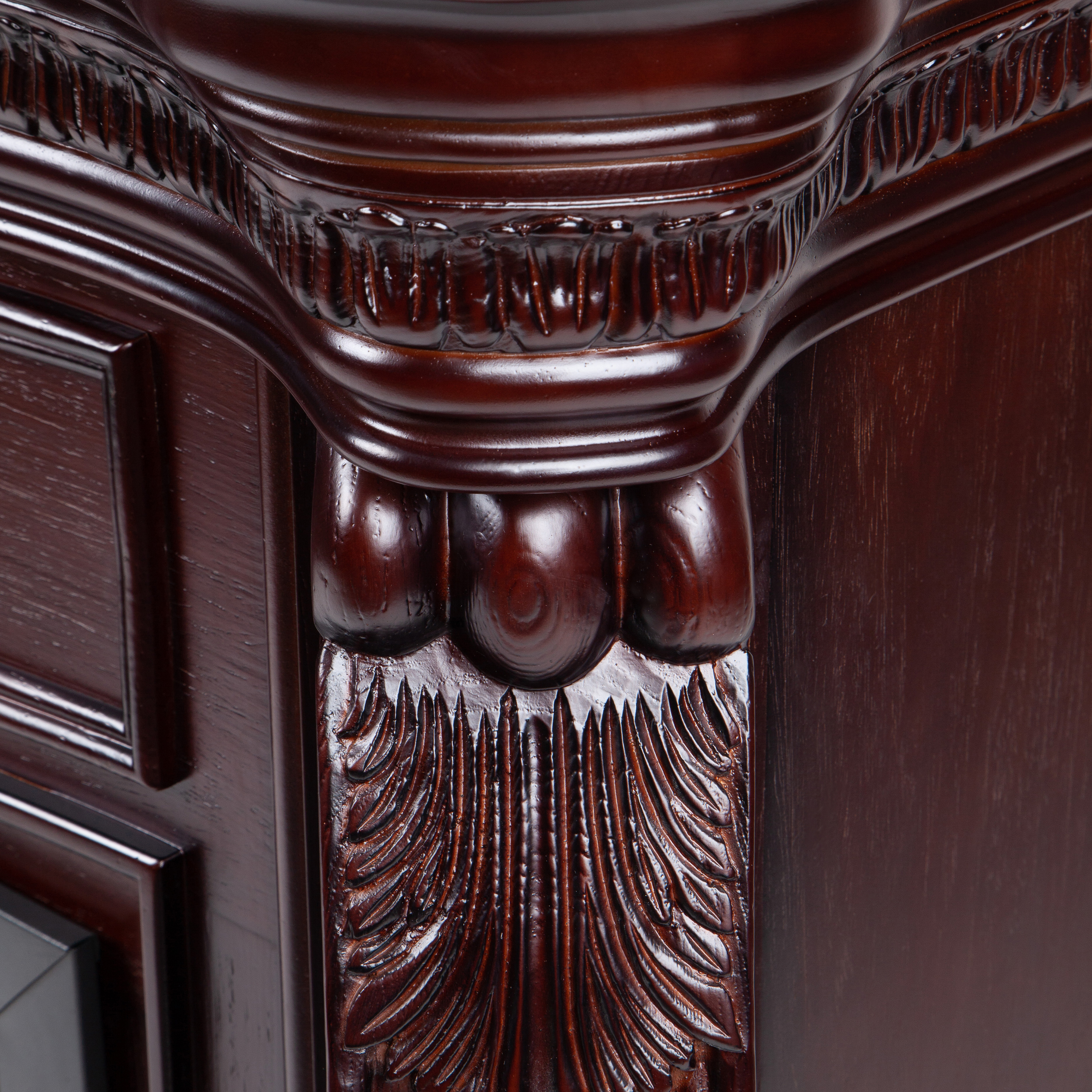 - Выполнен из качественного МДФ и тонированного шпона. Украшен резьбой по дереву и колоннами.