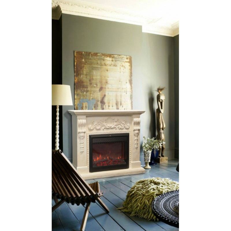 - Портал станет ярким акцентом современного интерьера, благодаря лаконичности форм и оригинальности текстуры. Сдержанный дизайн обрамления с элементами замкового стиля подчеркивается природной фактурой под натуральный камень. Такой камин добавит в обстановку комнаты солидности, а светлый оттенок портала визуально не перегрузит пространство.
