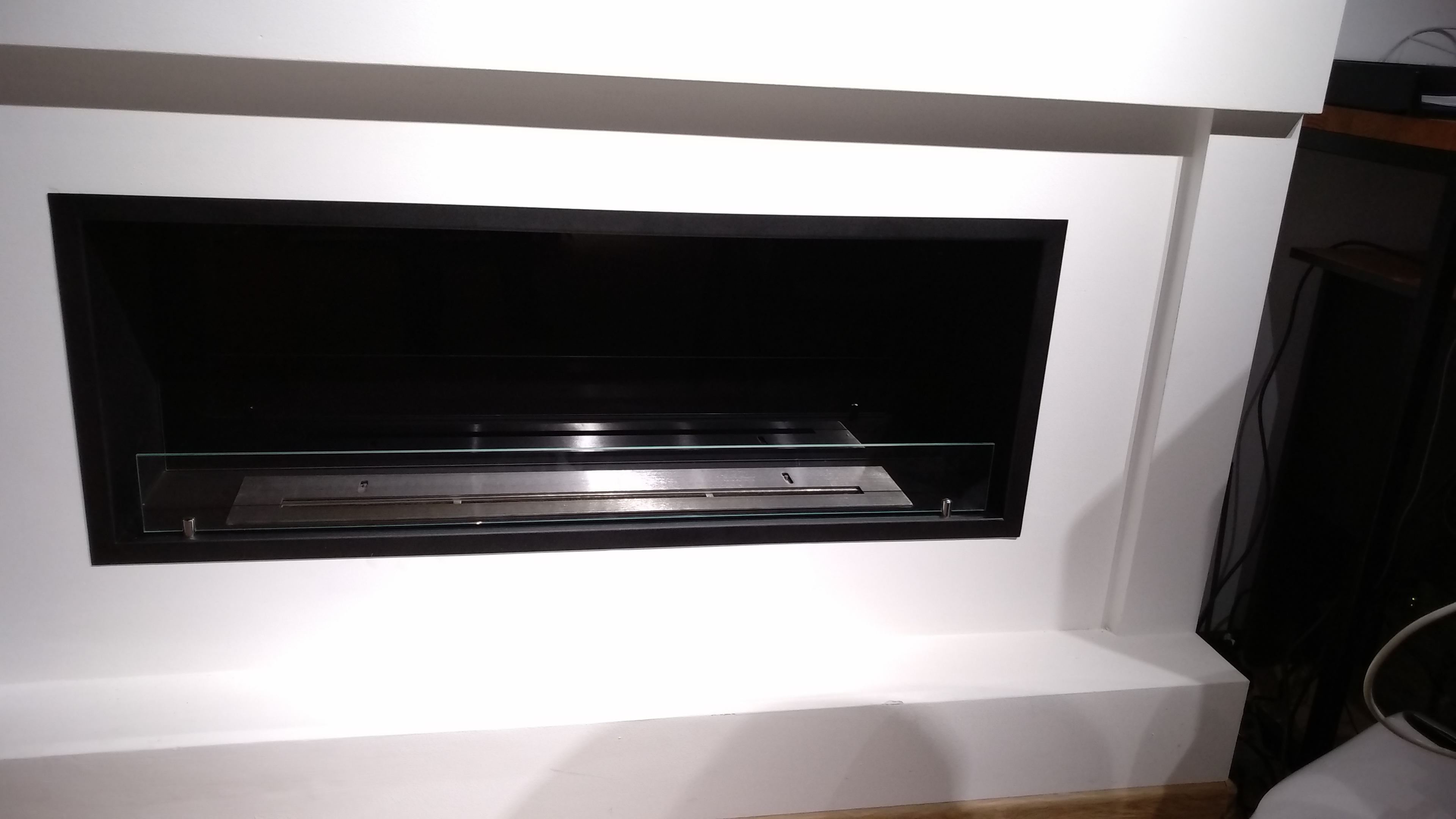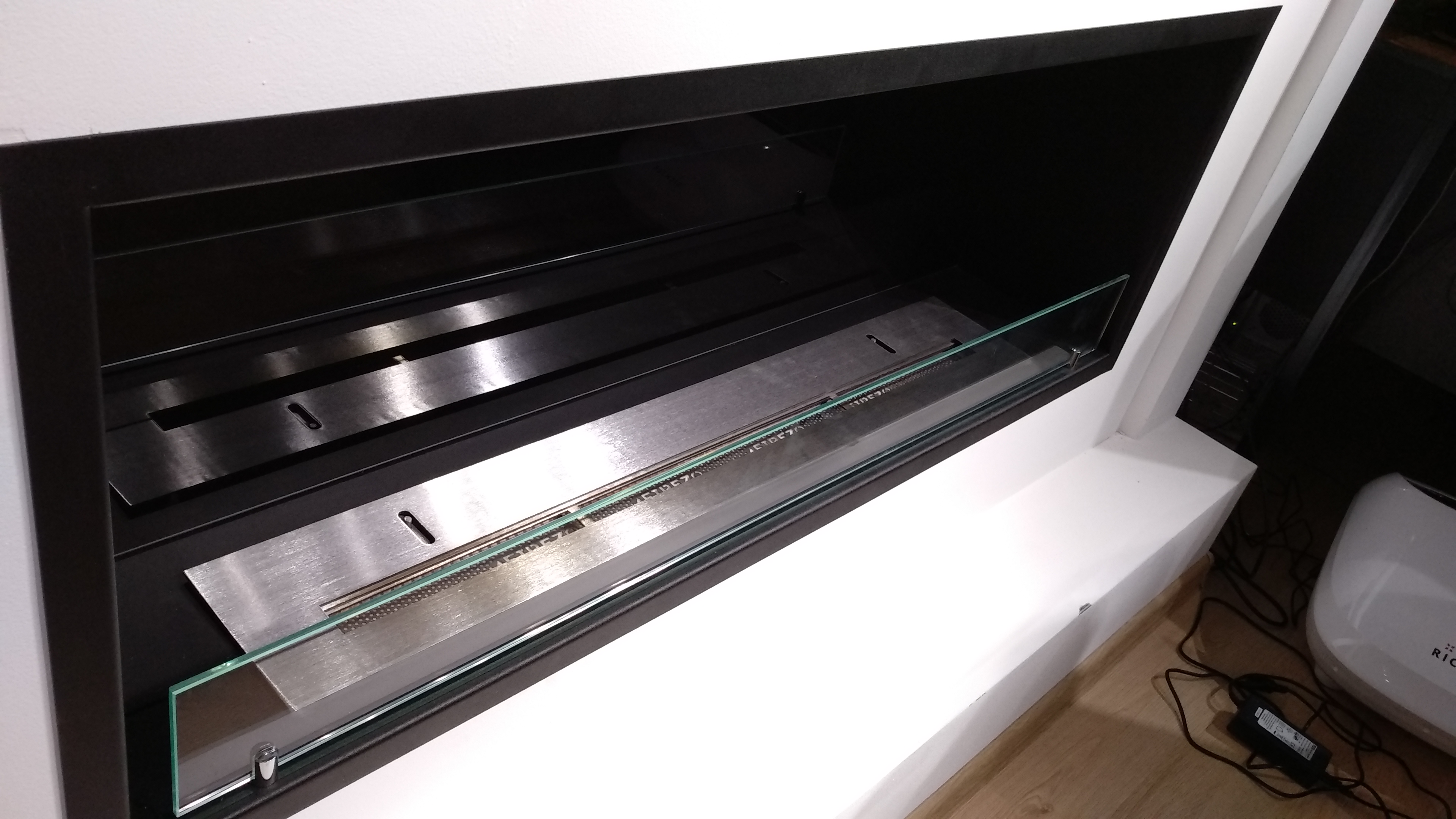 Встраиваемый биокамин с размерами корпуса ДхВхГ 1210х450х250 мм. Изготовлен из стали толщиной 2 мм. Окрашен черной порошковой краской с фактурой Муар. На заднюю стенку вклеено стекло стемалит черного цвета, впереди установлено защитное стекло на стеклодержателях. Топливный блок с длинной линии огня 800 мм.