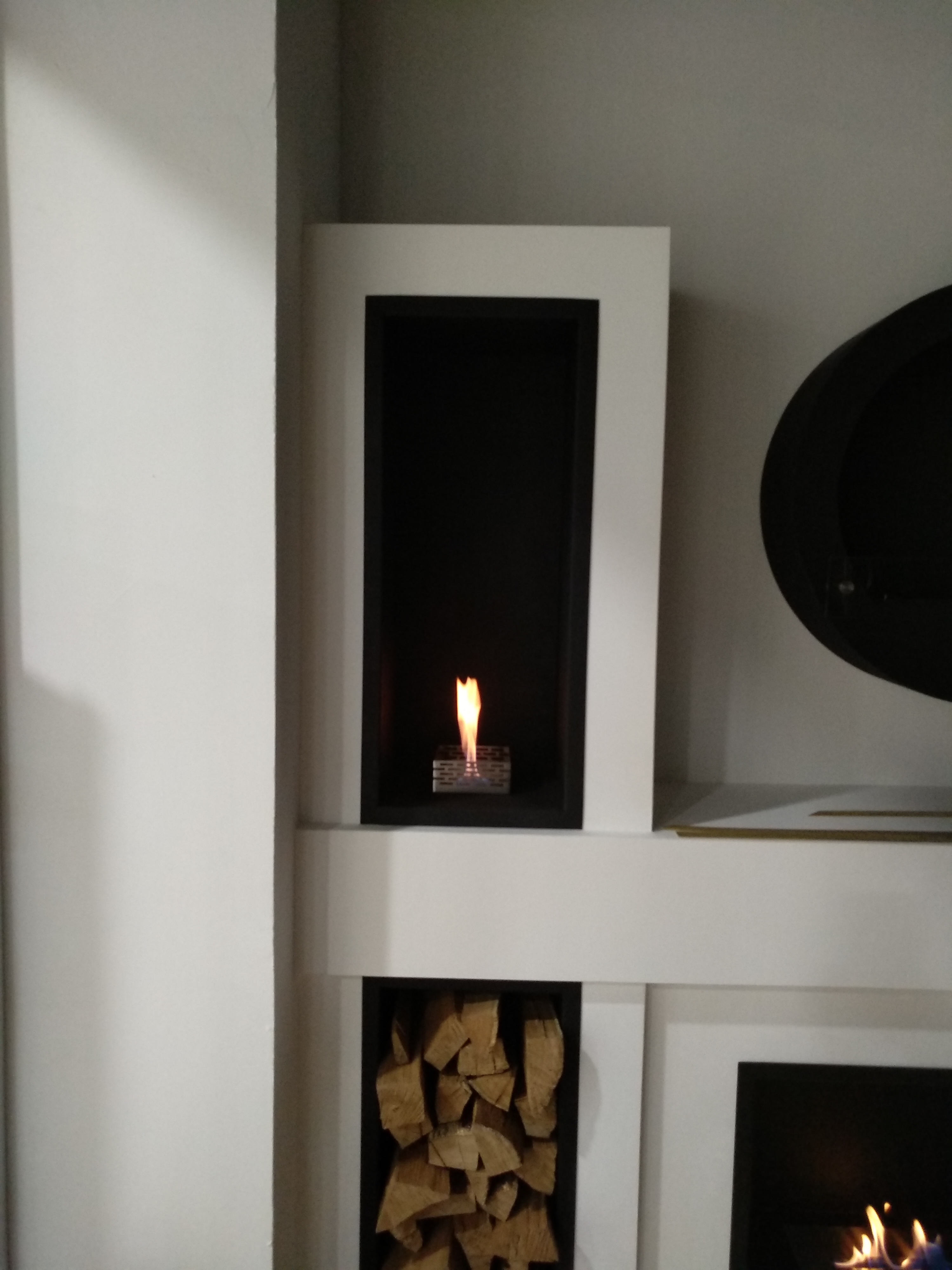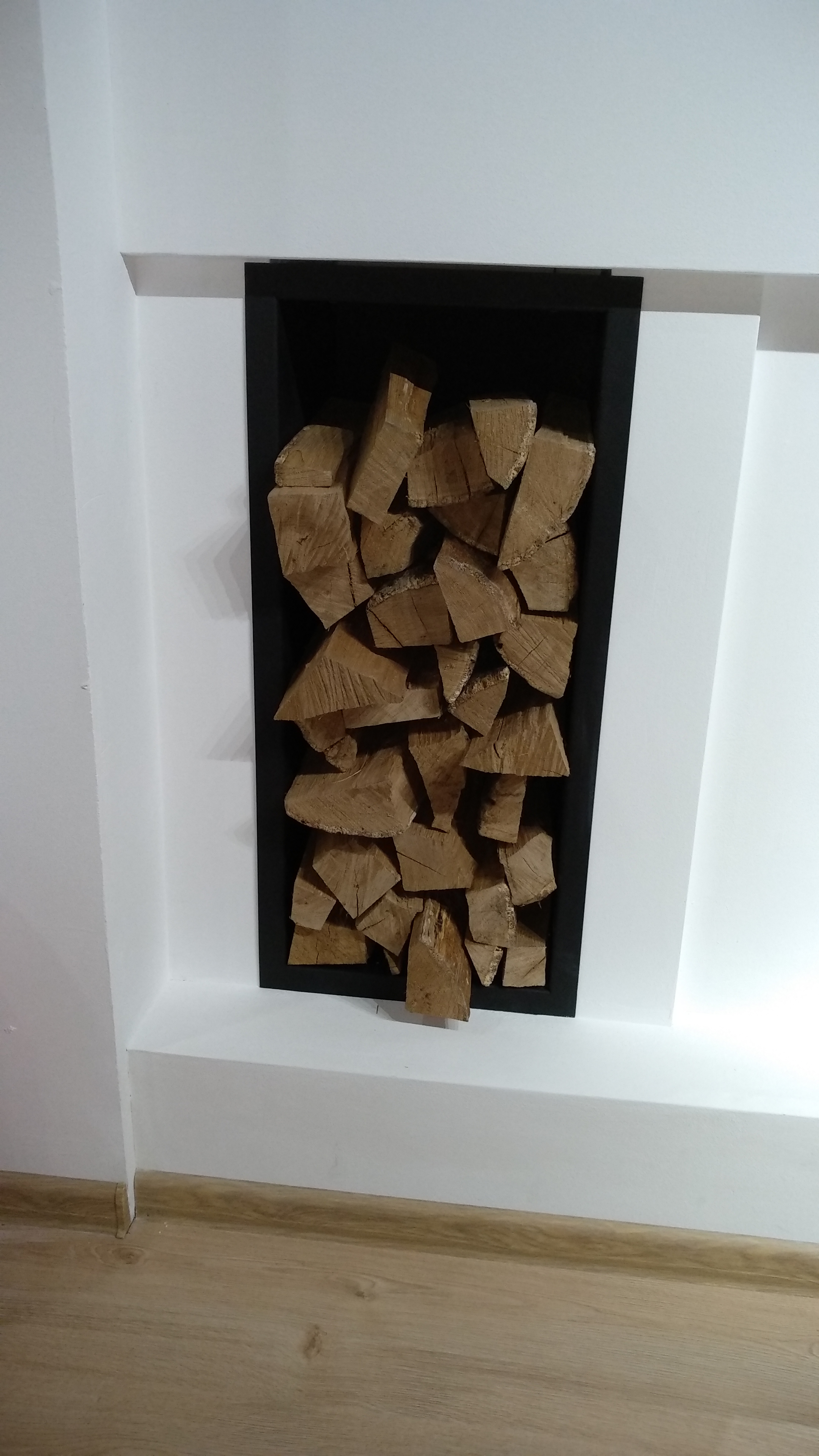 Вертикальный биокамин для нашего шоу рума и дровница с размерами ДхВхГ 350х810х290 мм. Корпус камина и дровницы из стали толщиной 2 мм, окрашены черной порошковой краской с фактурой Муар. Топливный блок с декоративной решеткой из нержавеющей стали с длинной линии огня 50 мм.